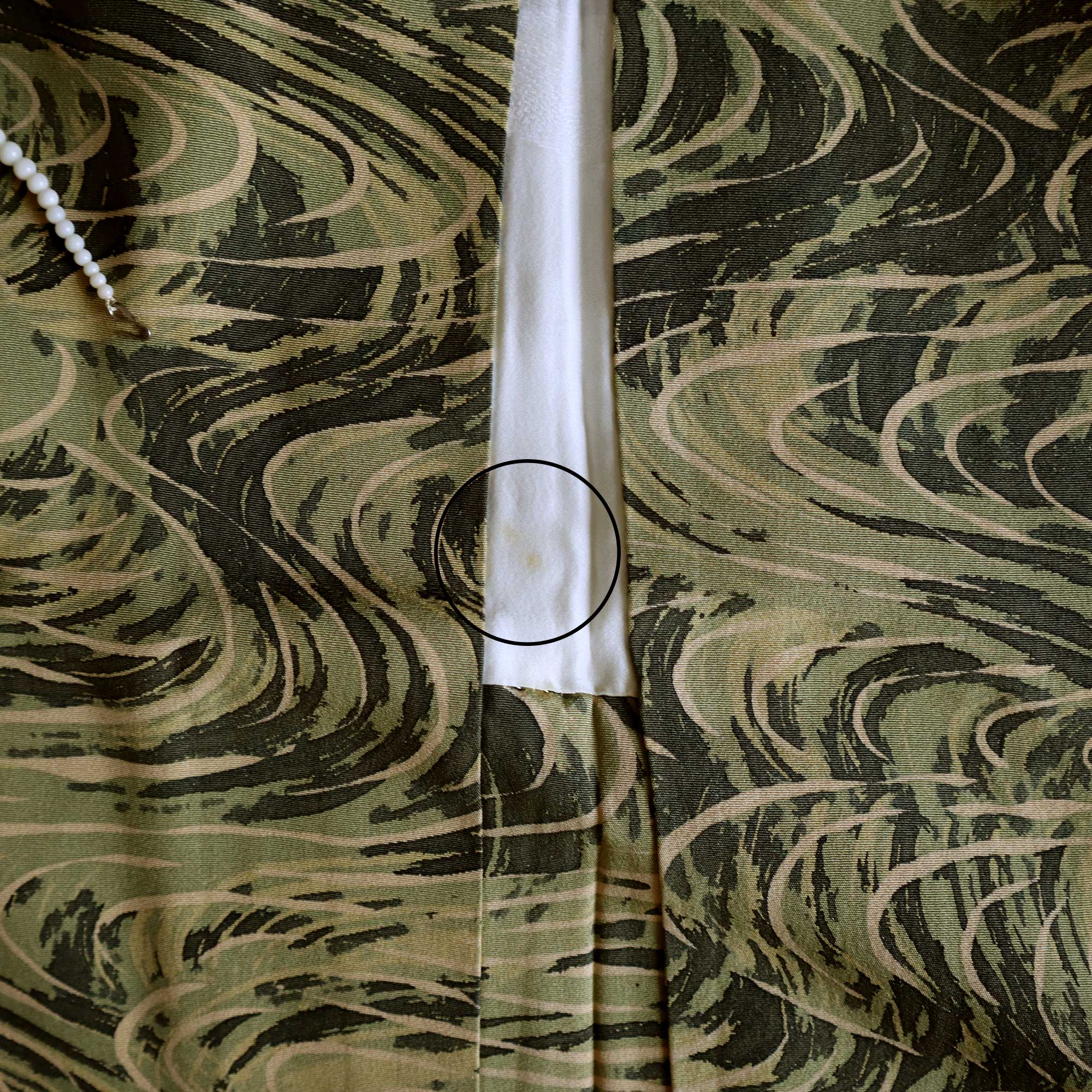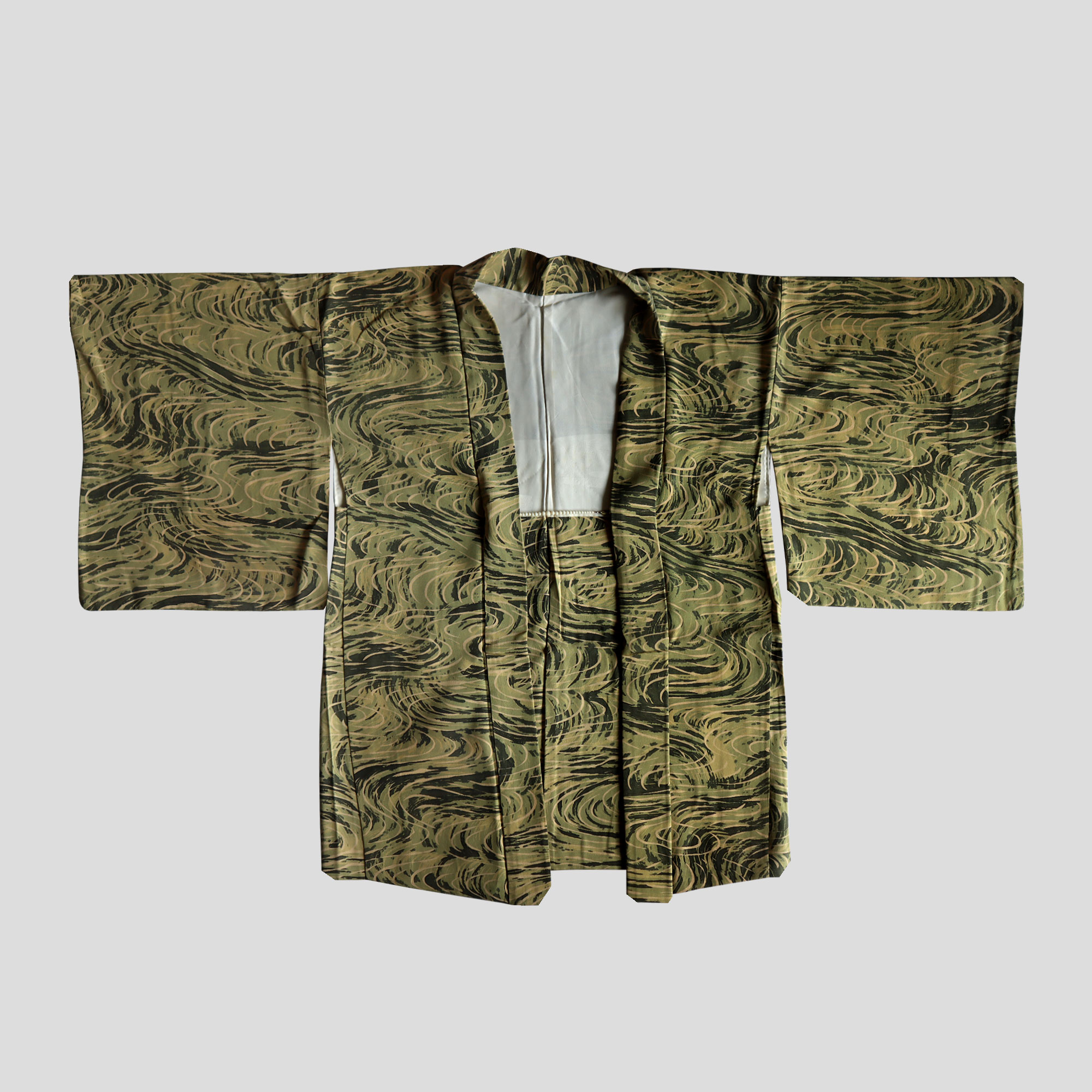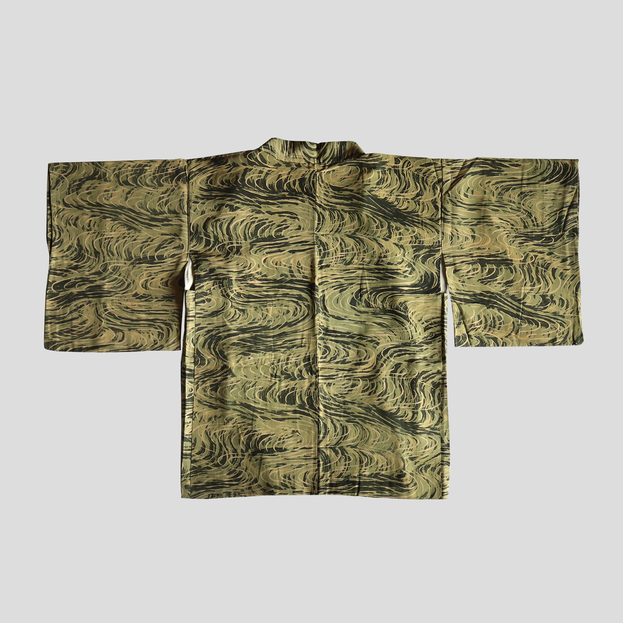 Cet Haori a un motif vert vintage rappelant des ondulations à la surface de l'eau, ou bien des hautes herbes ondulantes sous le souffle du vent. Le motif ressemblant à de coup de pinceau d'un artiste peinture.