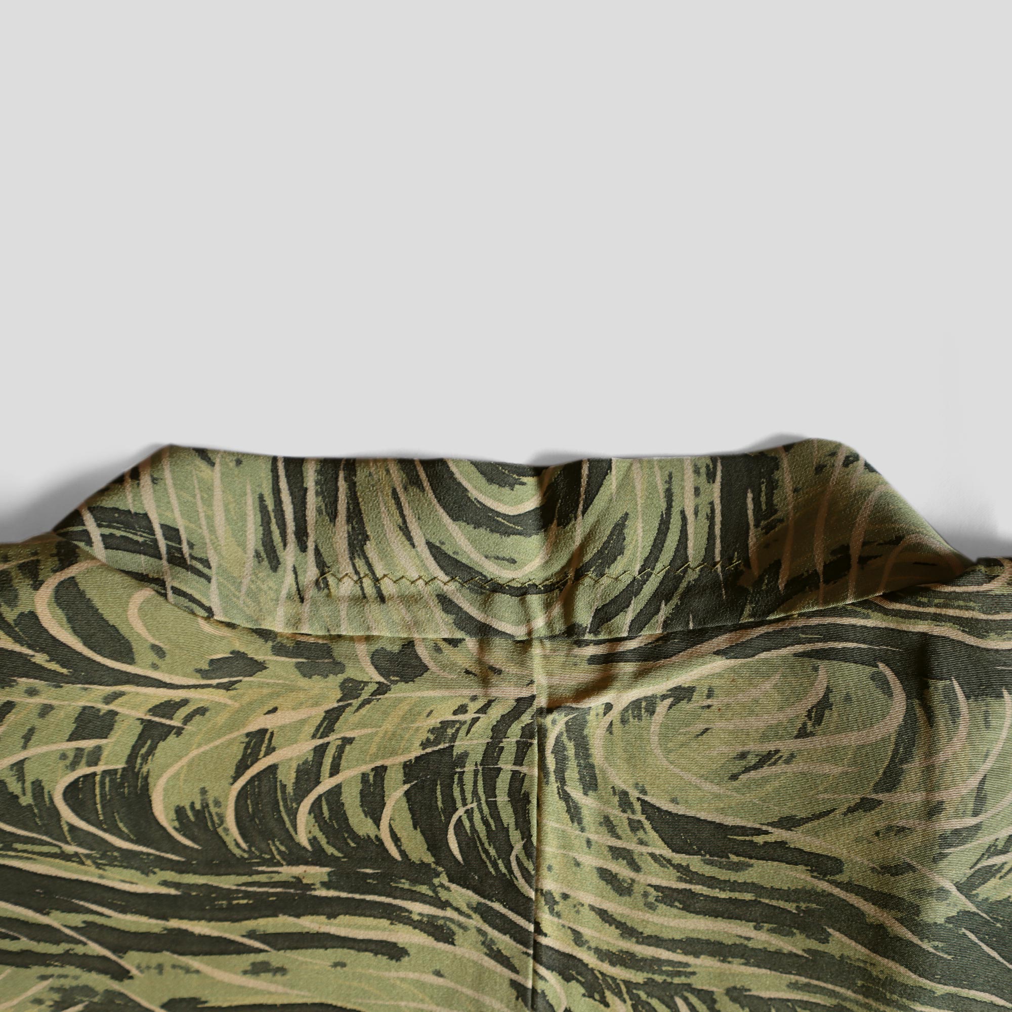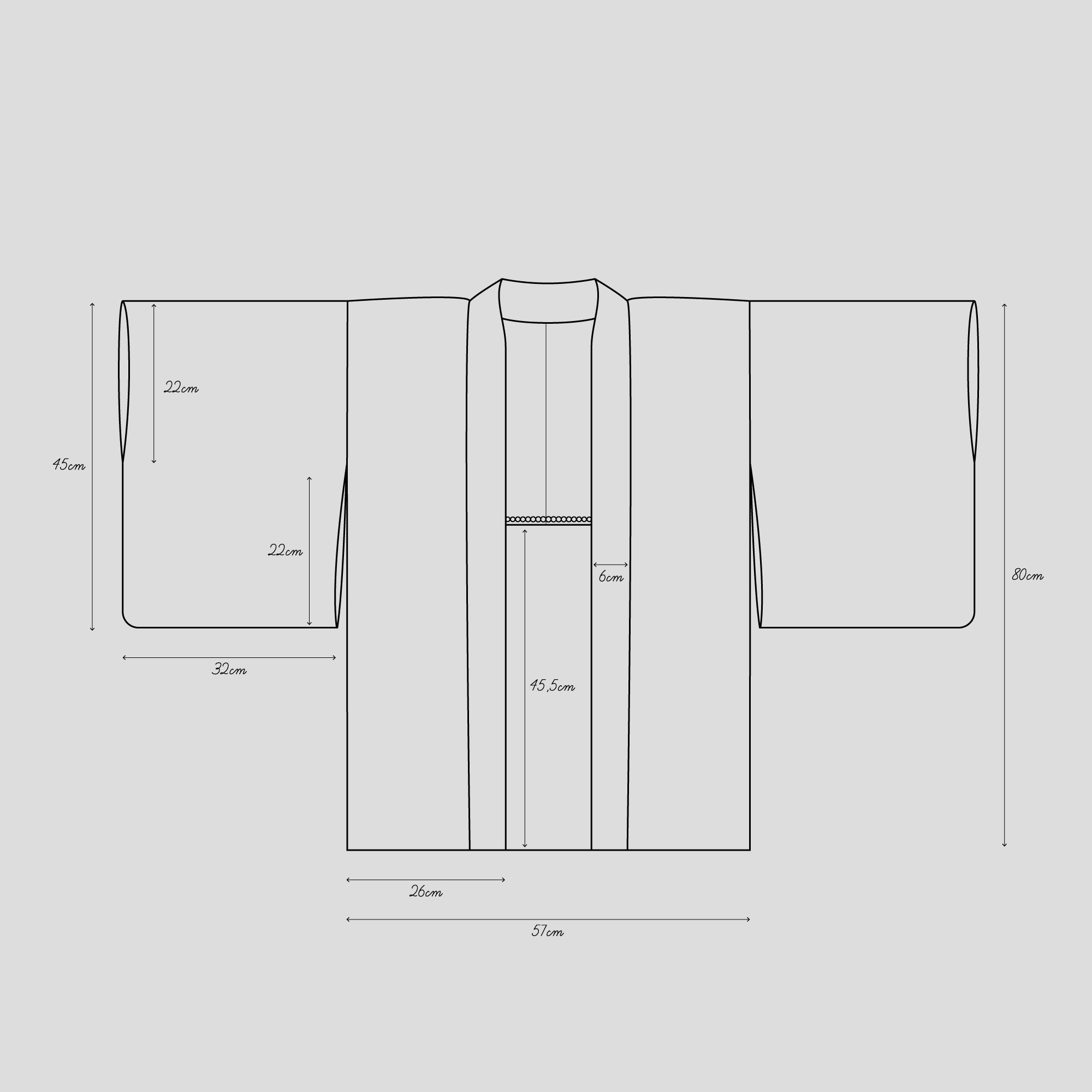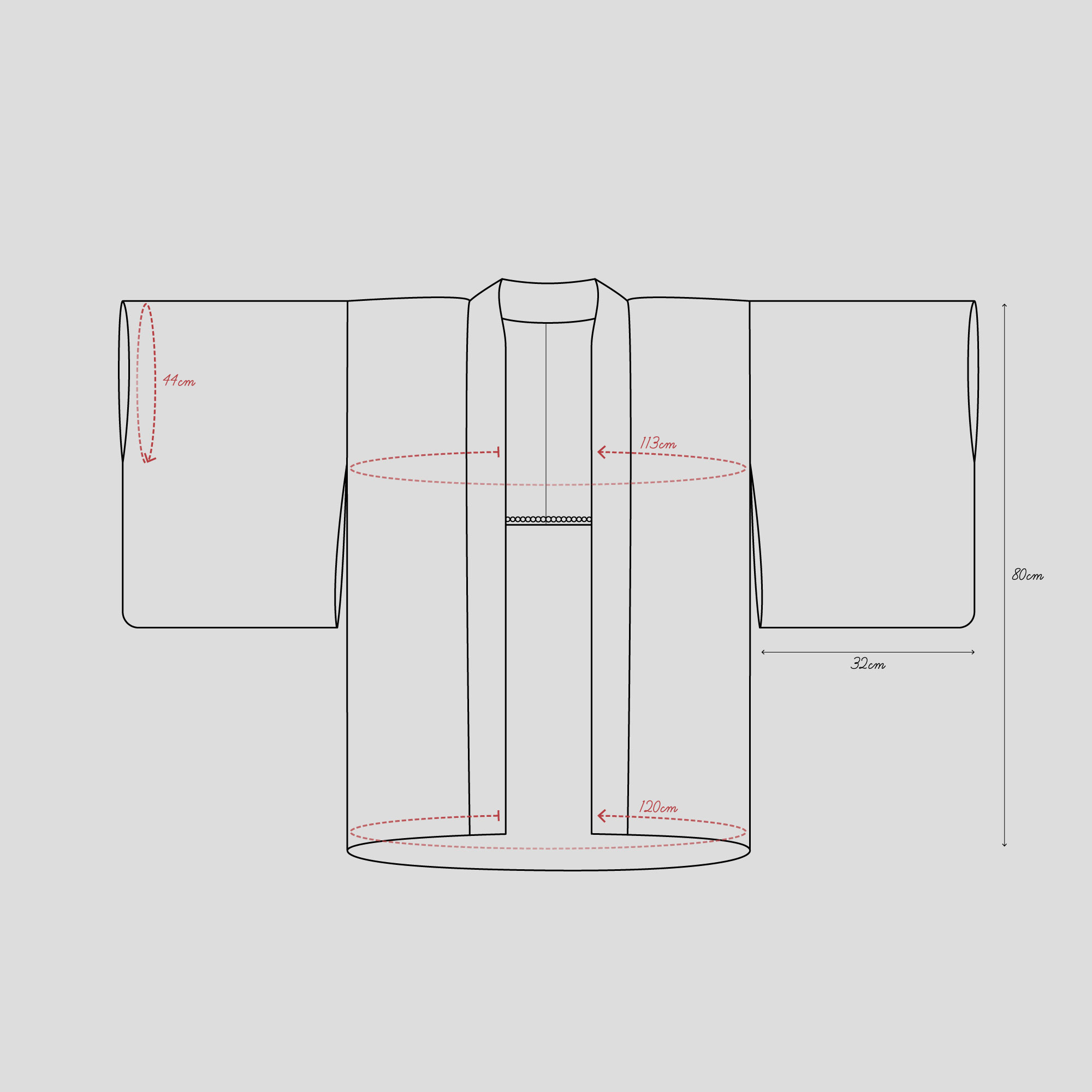 Cet Haori a un motif vert vintage rappelant des ondulations à la surface de l'eau, ou bien des hautes herbes ondulantes sous le souffle du vent. Le motif ressemblant à de coup de pinceau d'un artiste peinture.