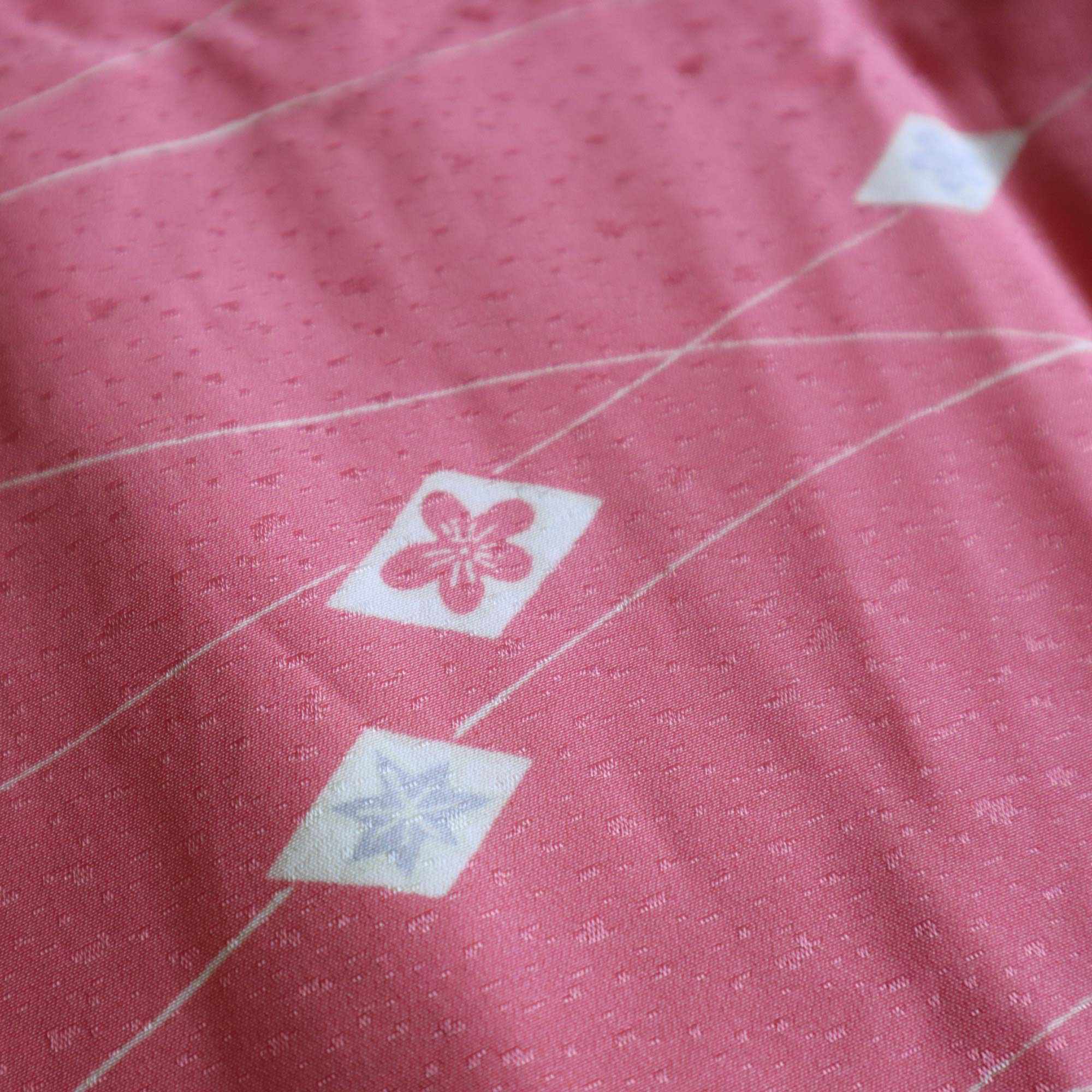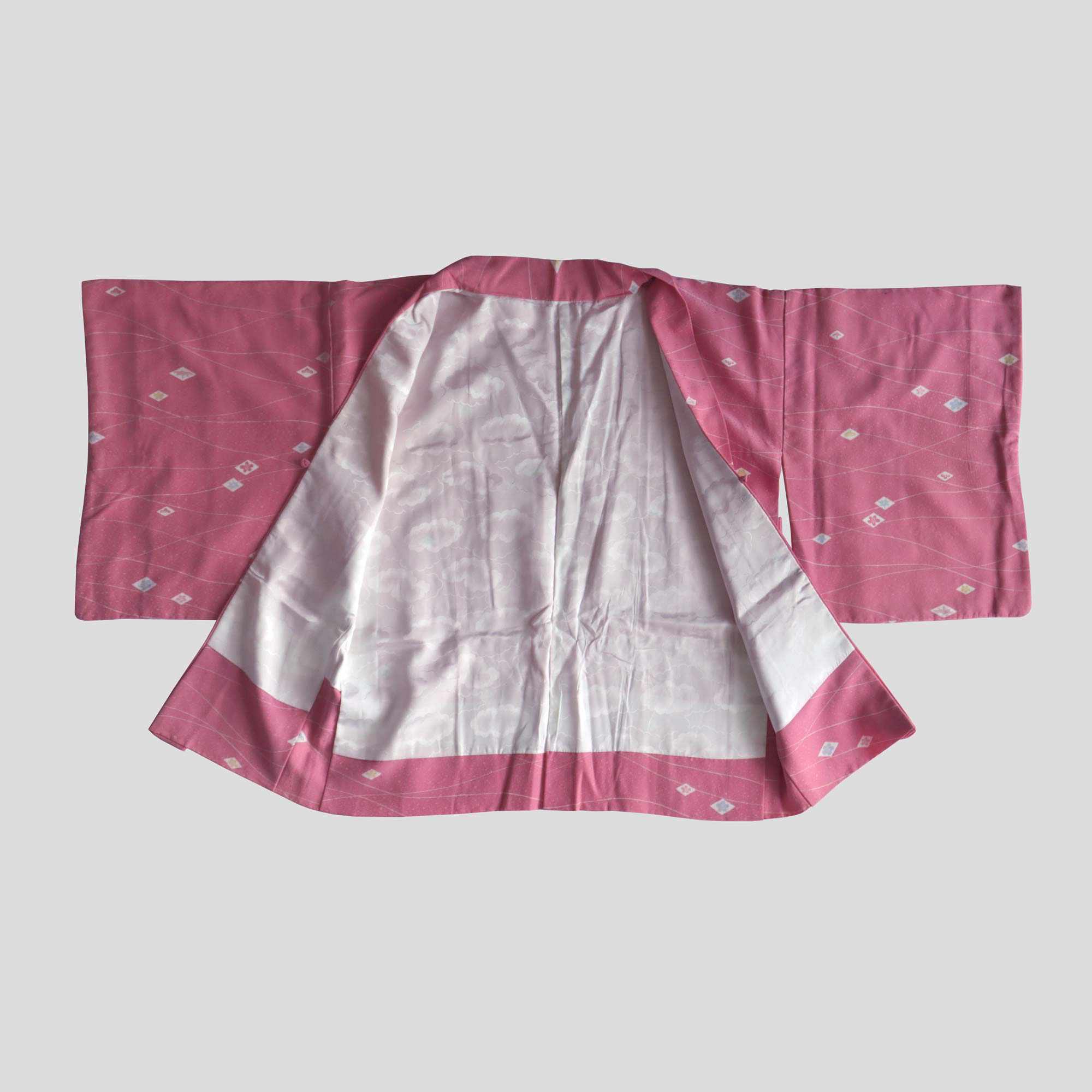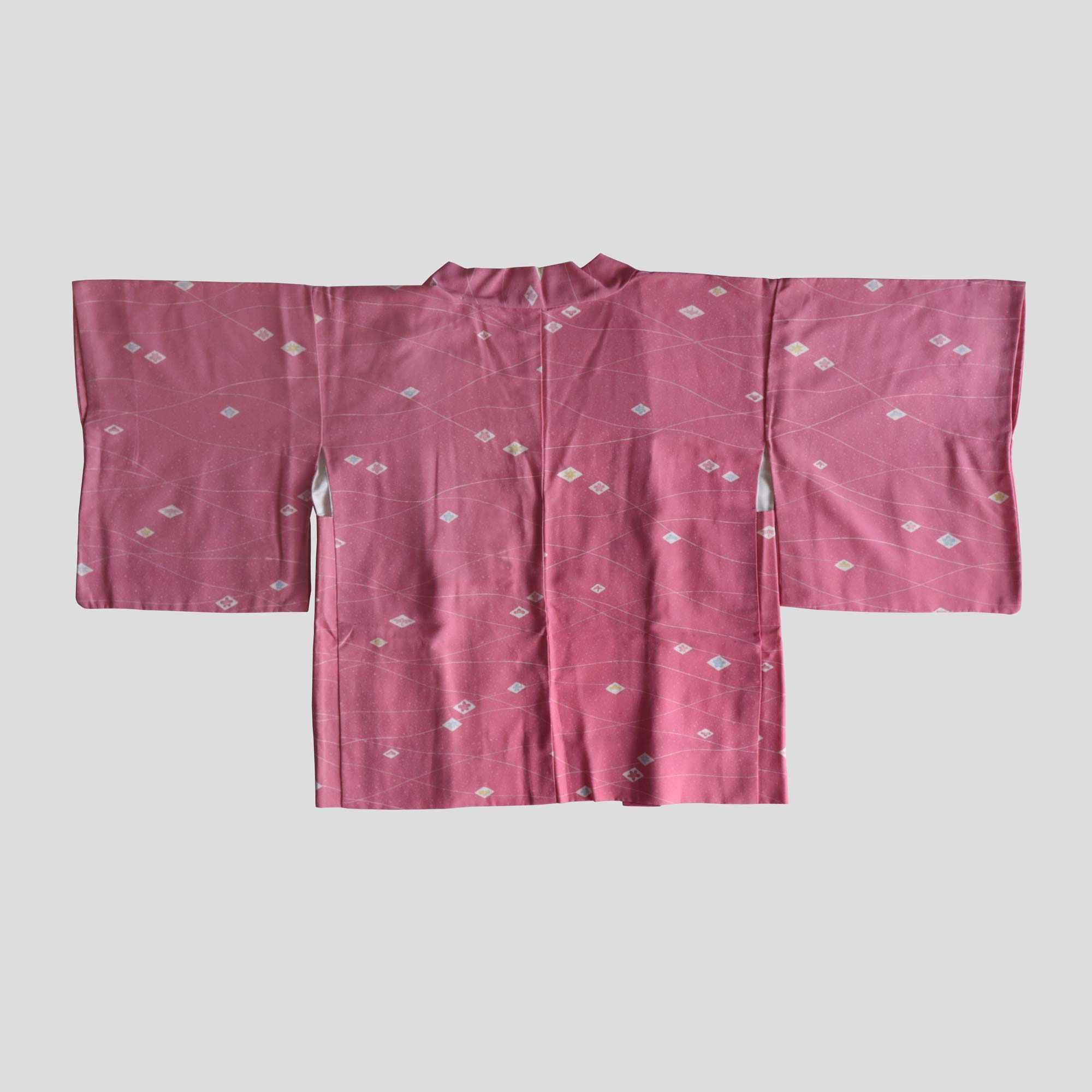 Ce haori rose délicat est orné d’un motif raffiné composé de petits losanges blancs, chacun renfermant des pictogrammes traditionnels japonais inspirés de la nature, tels qu'une feuille d’érable ou une fleur de prunier. De fines lignes blanches ondulent à travers le tissu, apportant une touche de légèreté et d’élégance à l’ensemble.