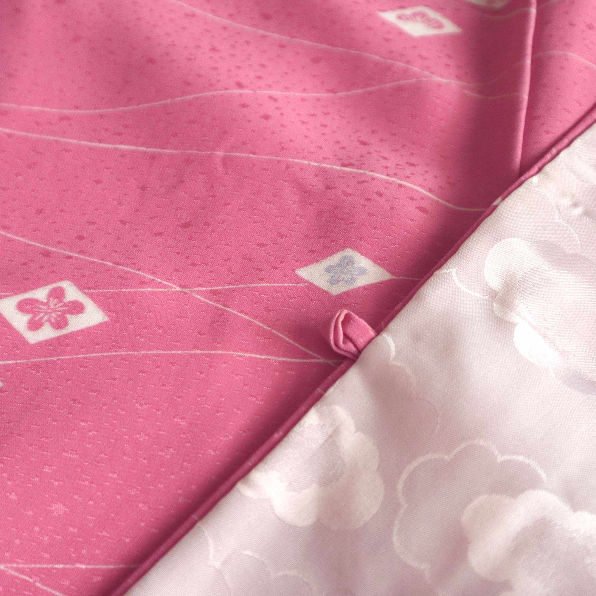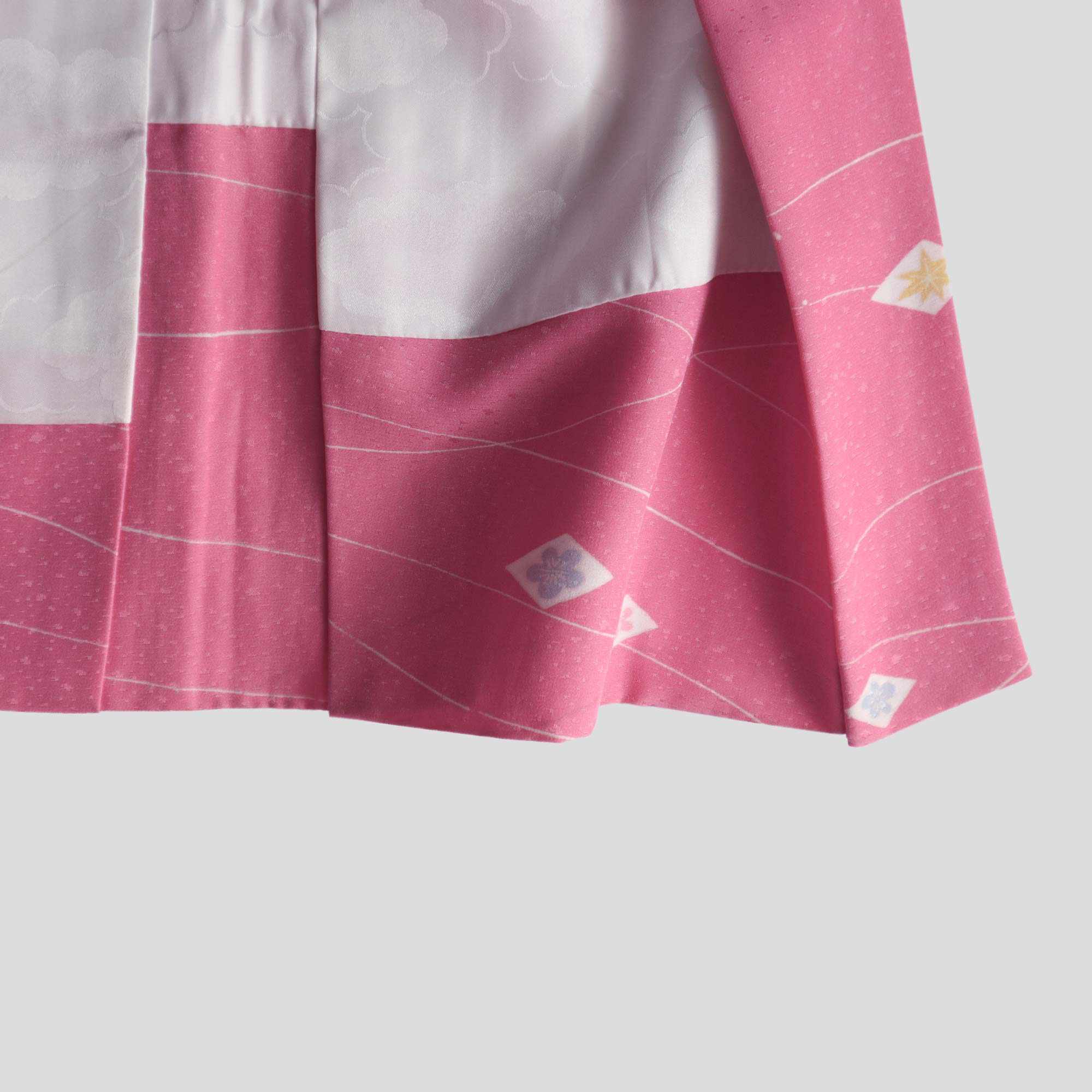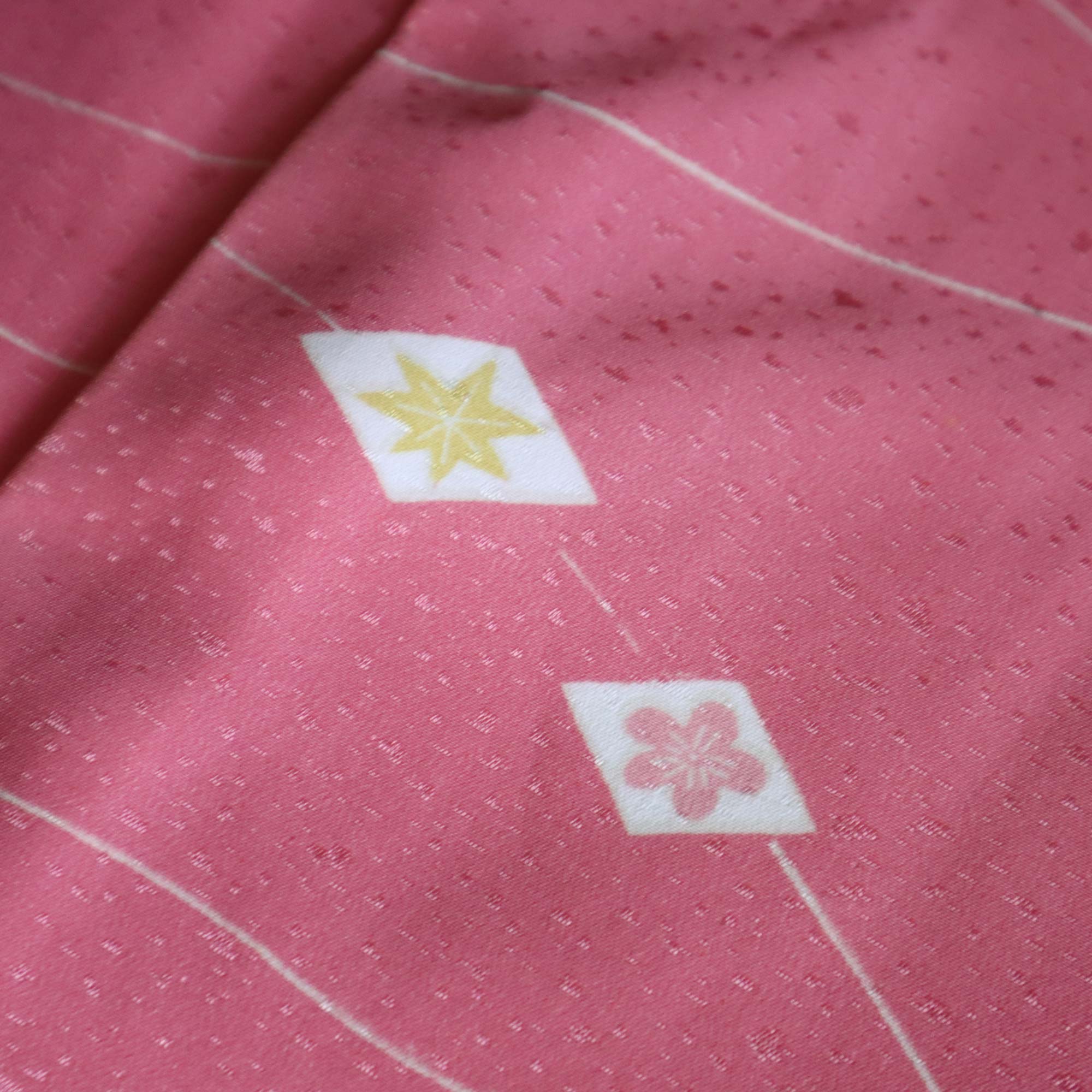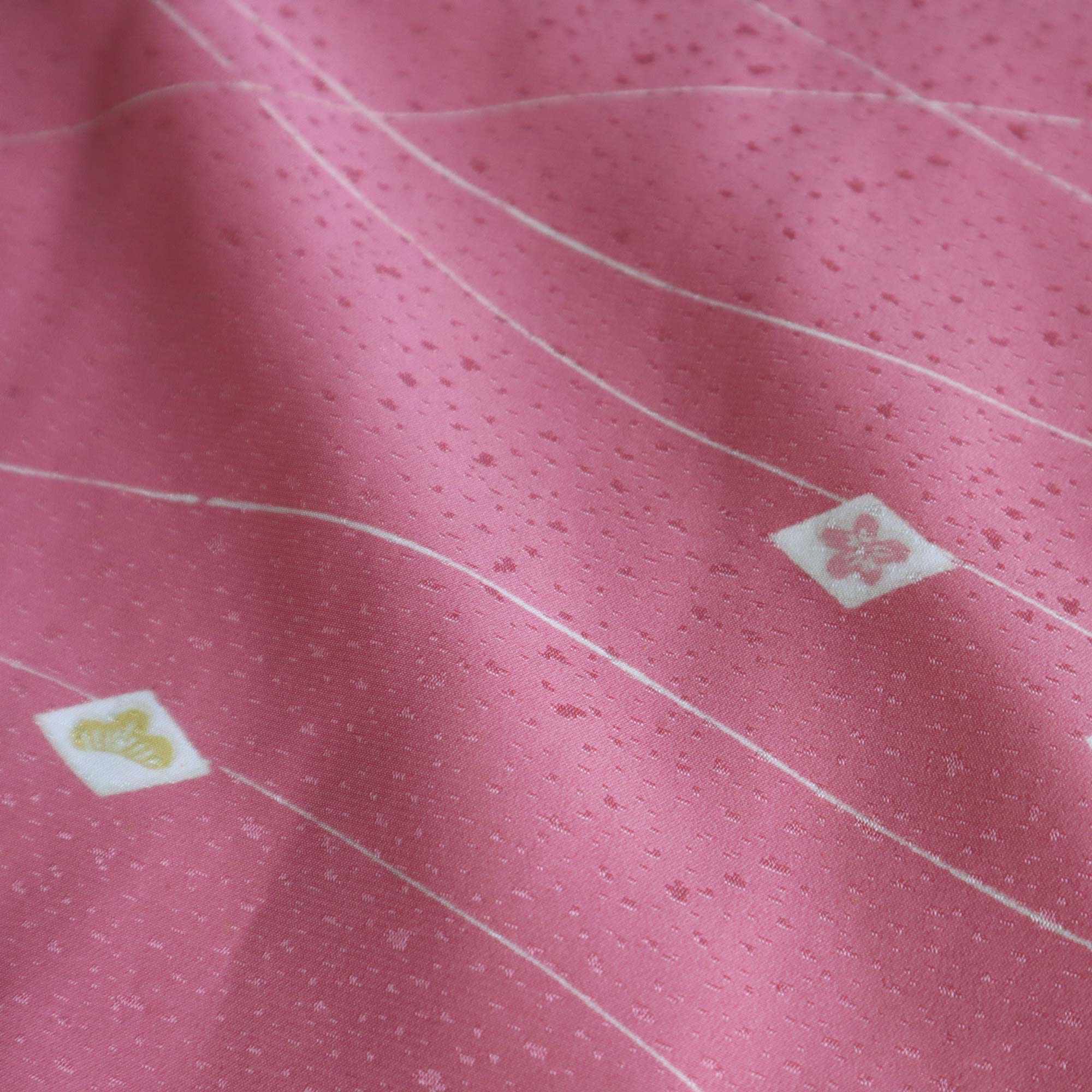 Ce haori rose délicat est orné d’un motif raffiné composé de petits losanges blancs, chacun renfermant des pictogrammes traditionnels japonais inspirés de la nature, tels qu'une feuille d’érable ou une fleur de prunier. De fines lignes blanches ondulent à travers le tissu, apportant une touche de légèreté et d’élégance à l’ensemble.