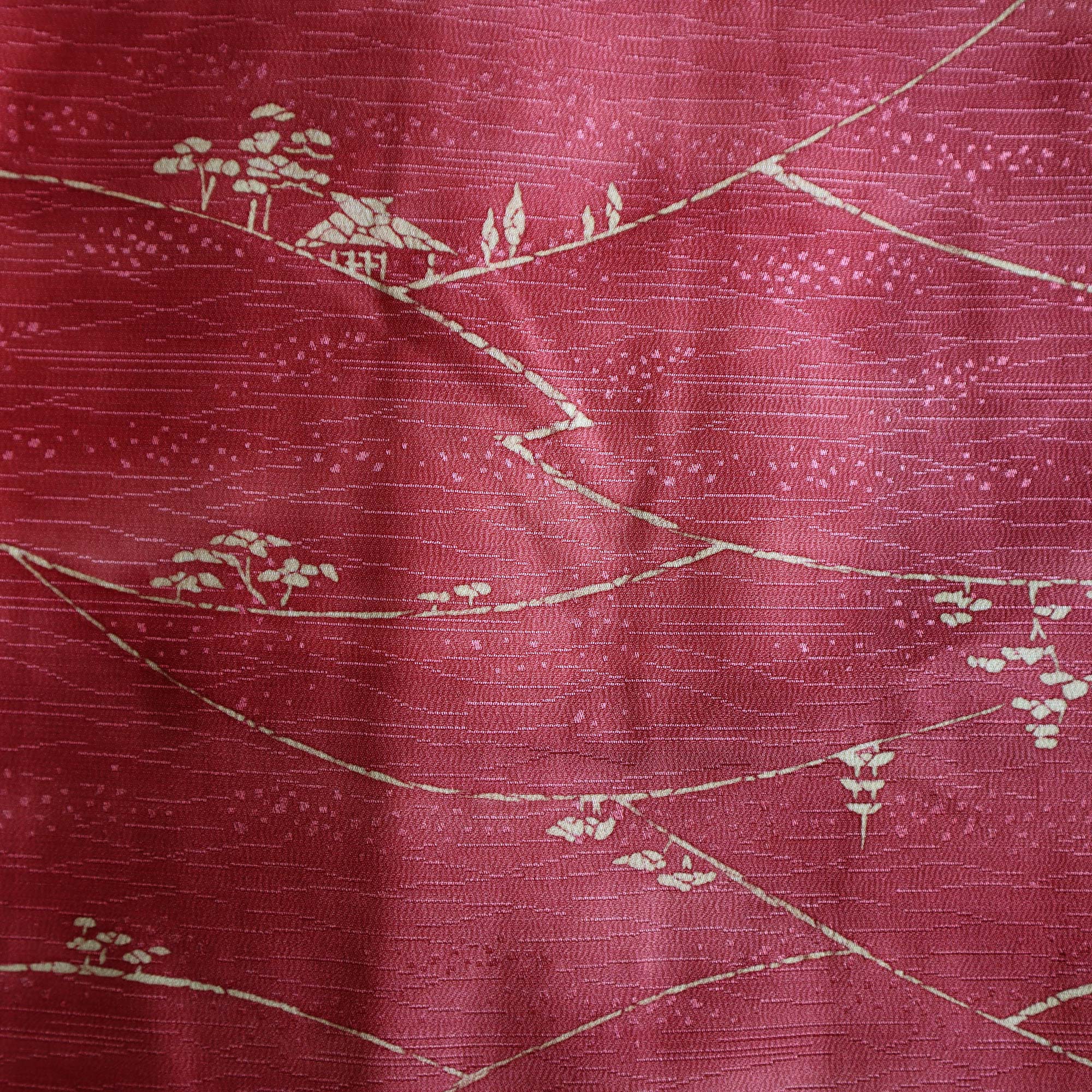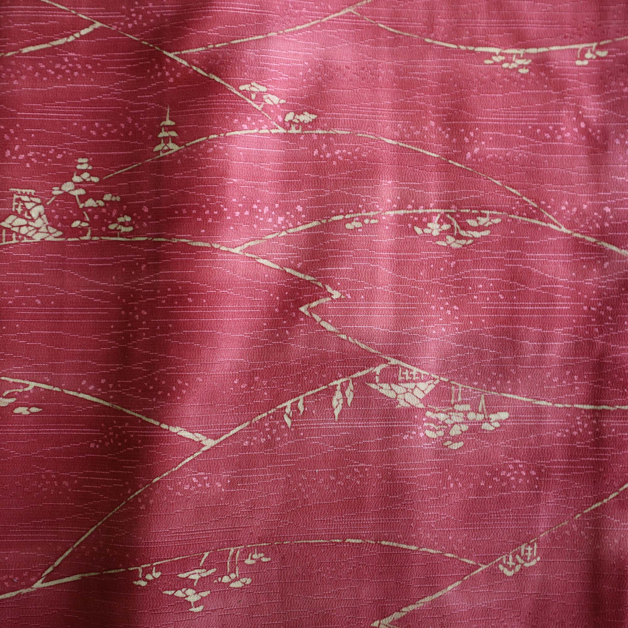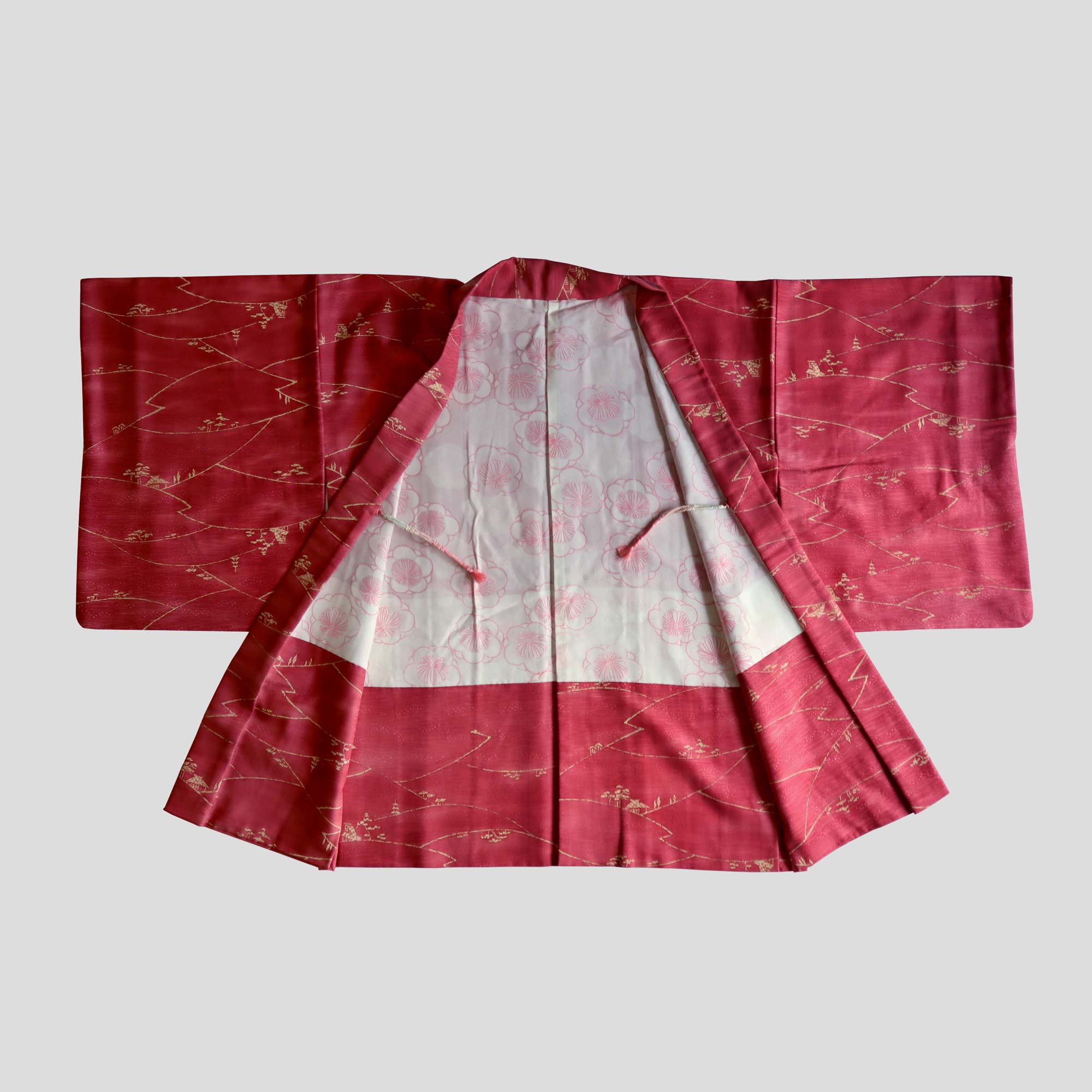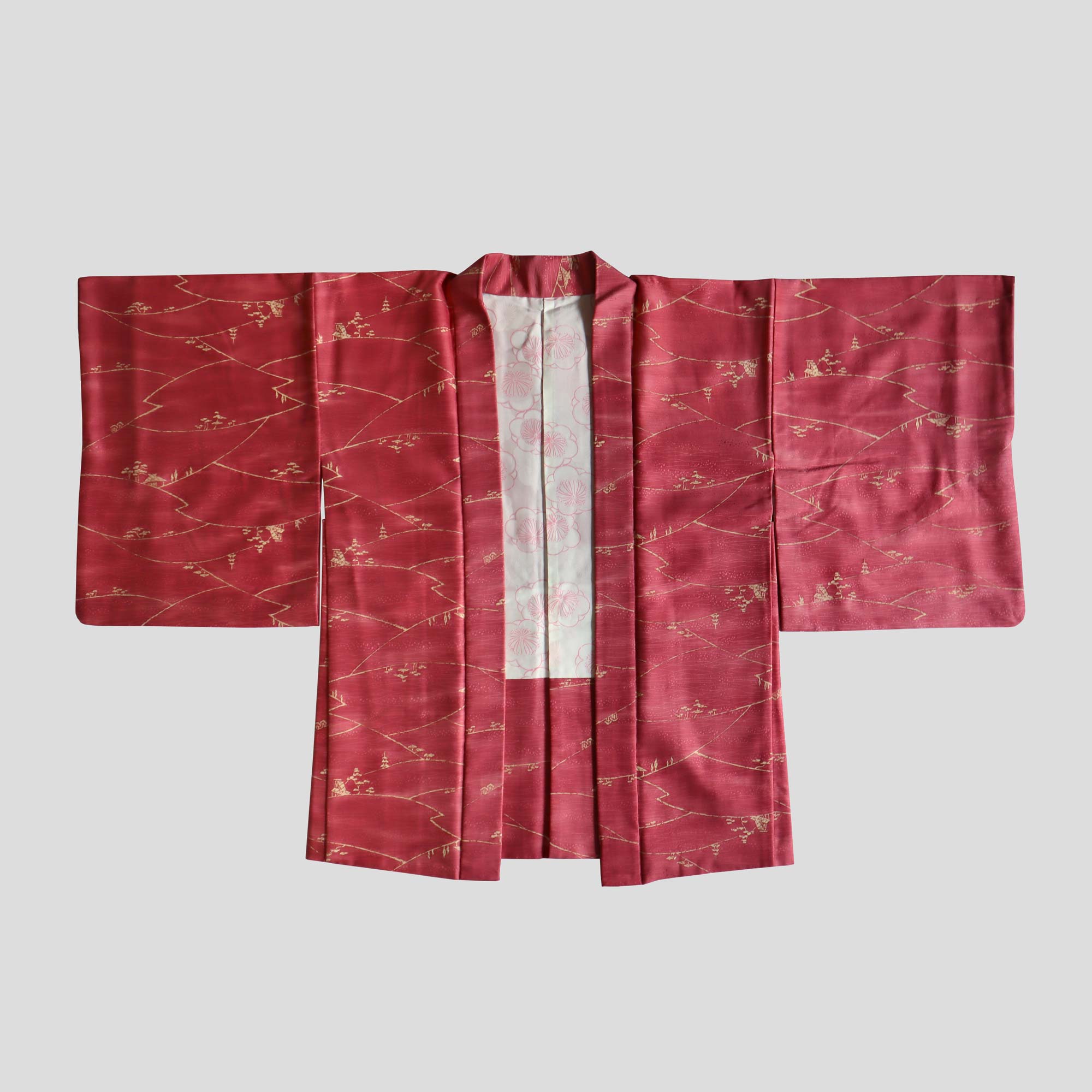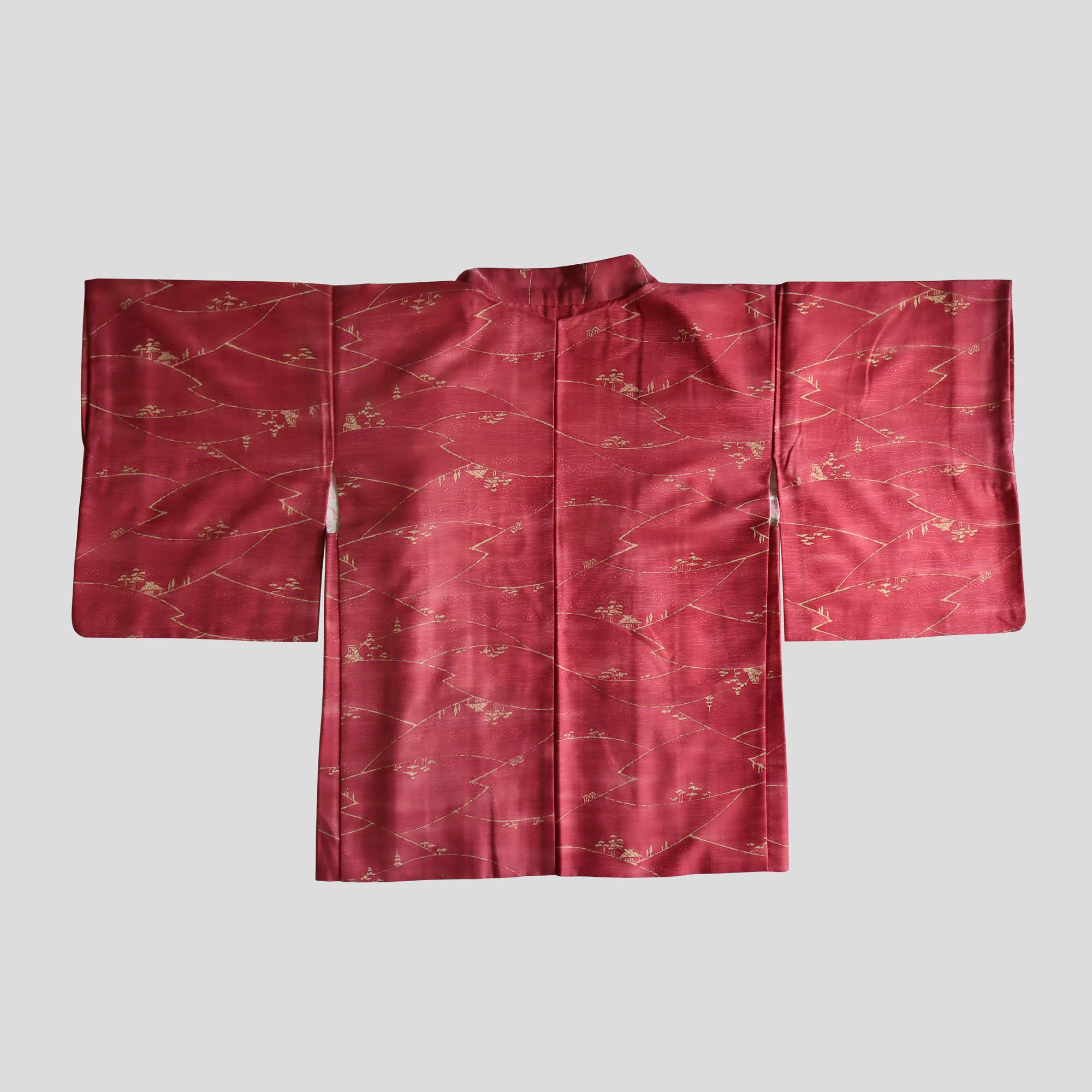 Un Haori de couleur rouge magenta orné d'un motif délicat représentant un paysage bucolique, composé de collines boisées et de maisons traditionnelles japonaises.