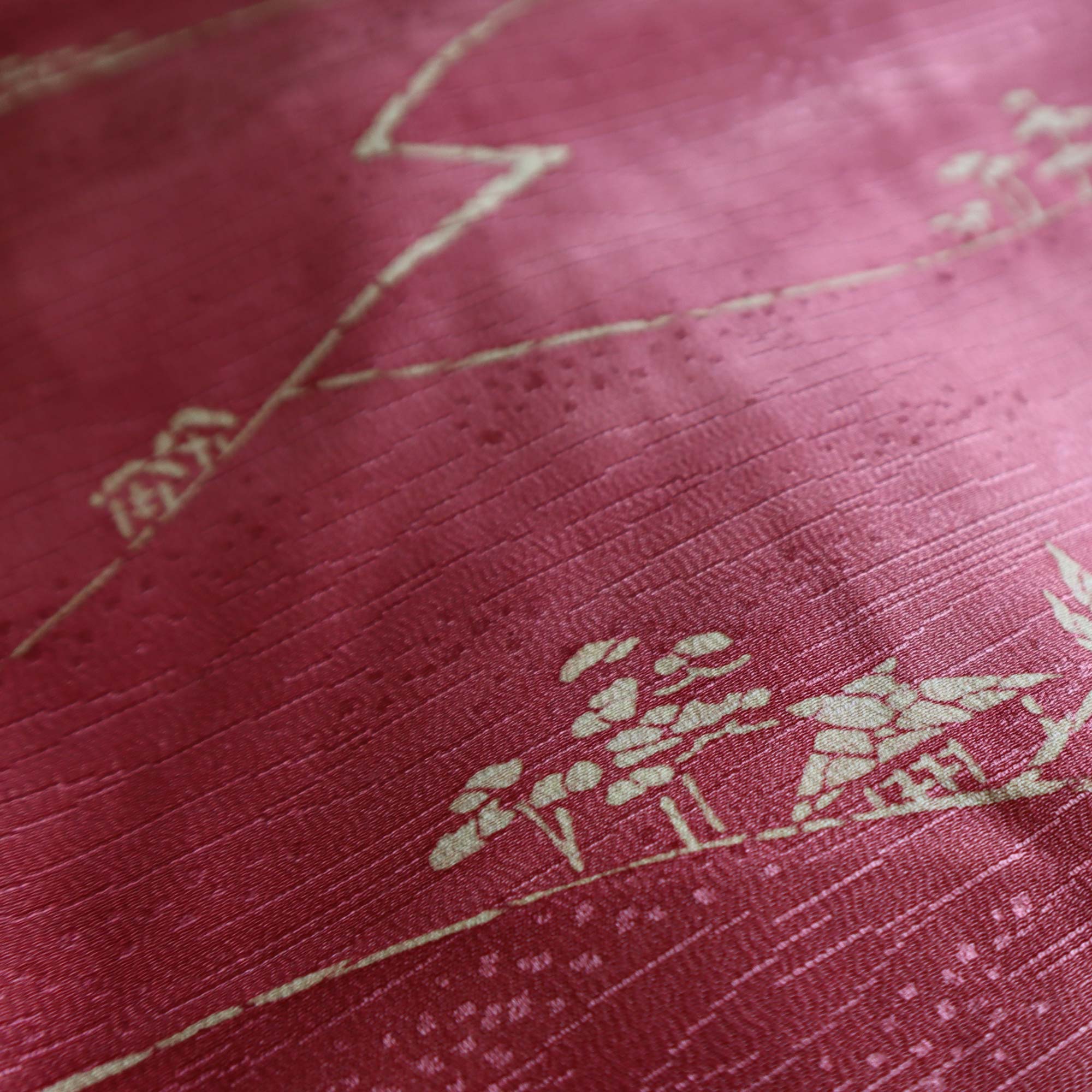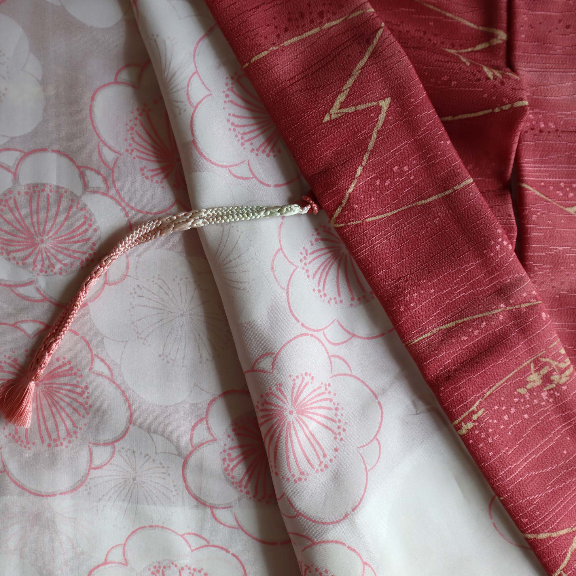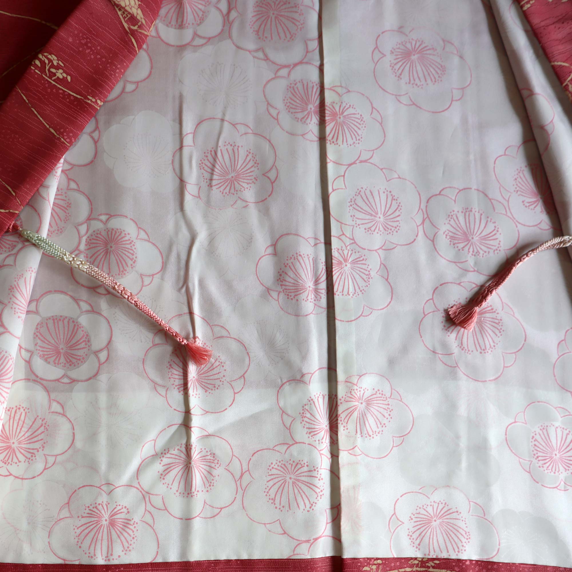 La doublure blanche est ornée de dessins de fleurs de prunier, certaines entièrement blanches, d'autres dessinées en contours magenta. Ces fleurs symbolisent au Japon la résilience et le renouveau, marquant l'arrivée du printemps malgré le froid de l'hiver.