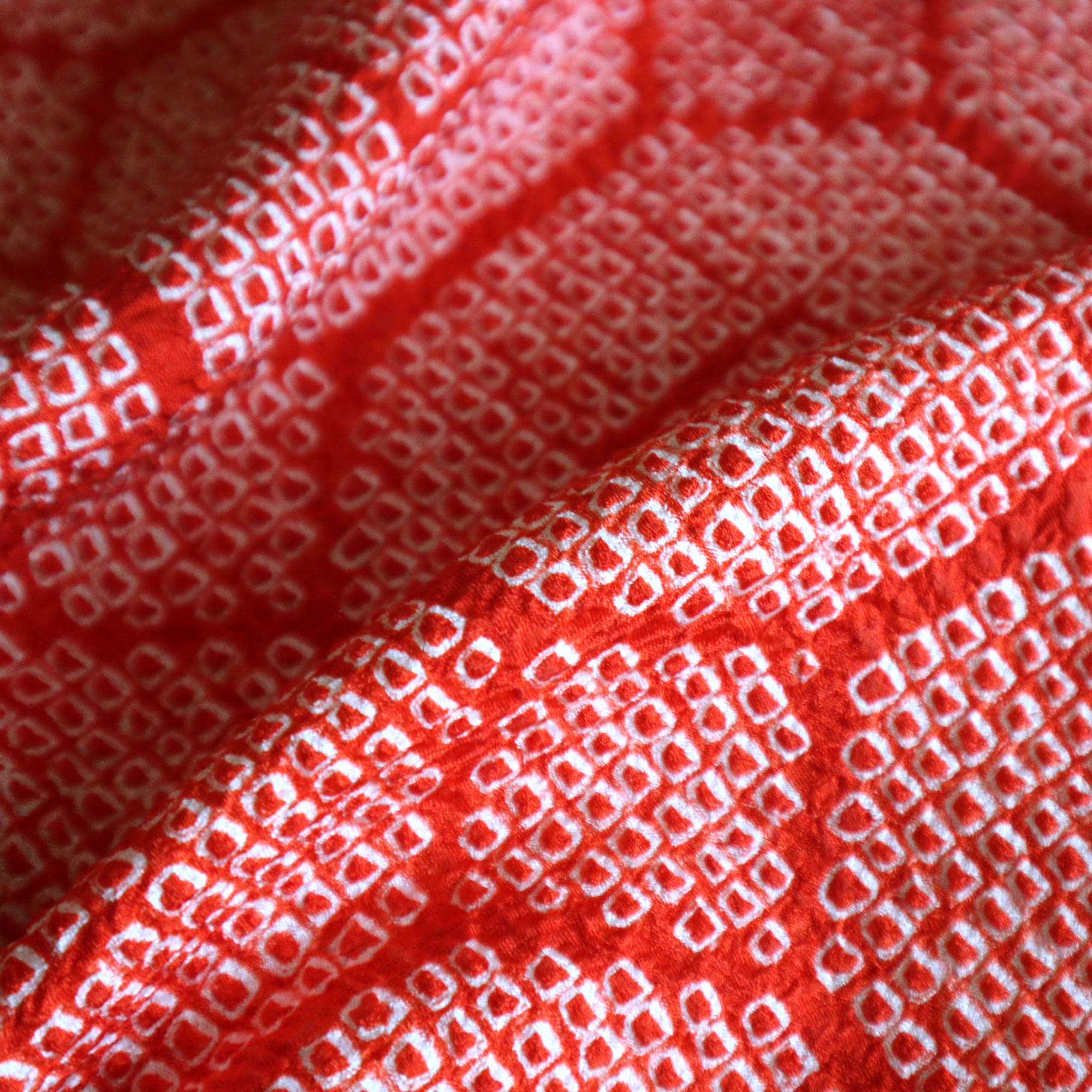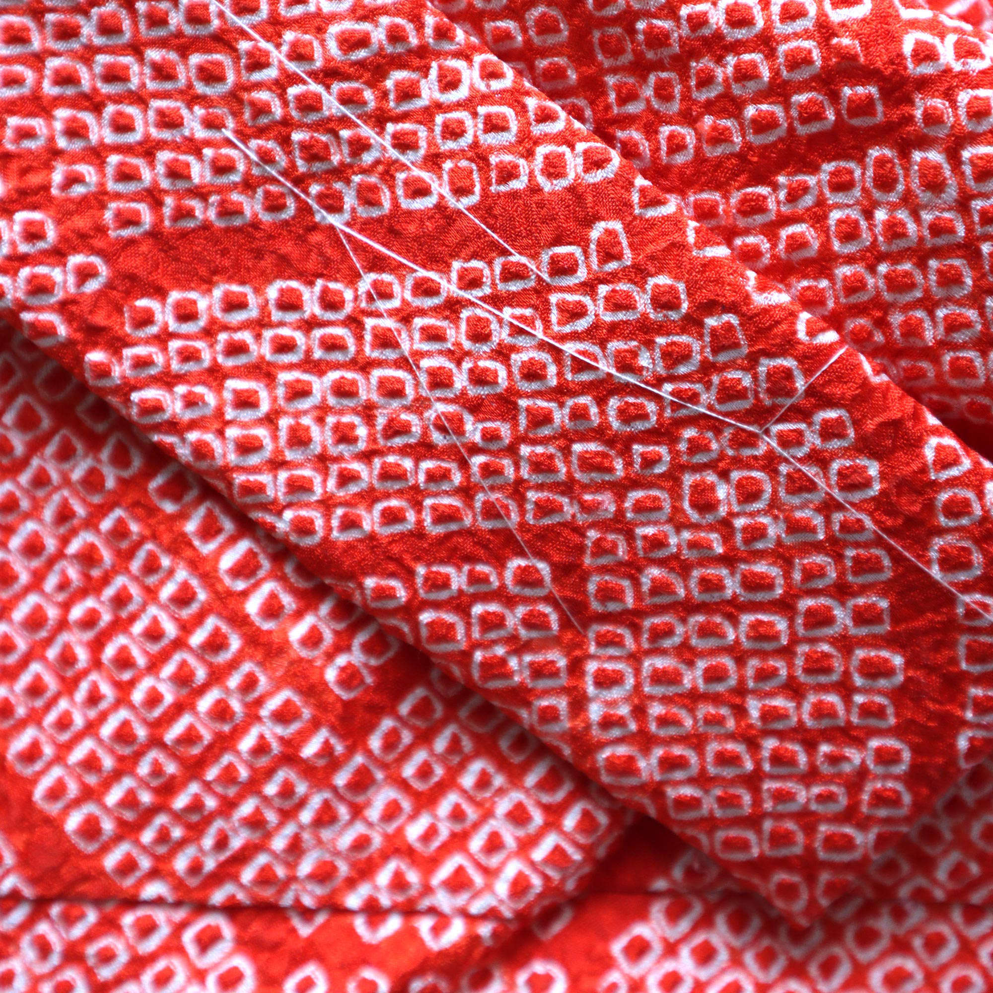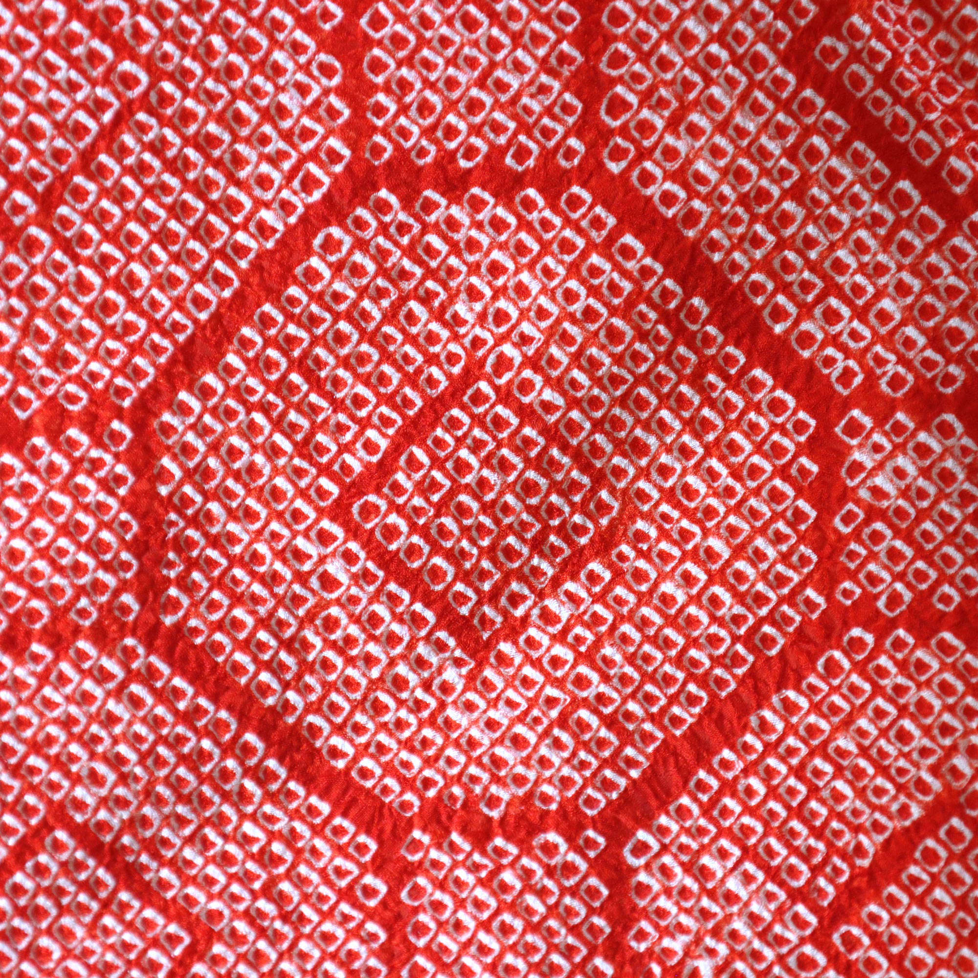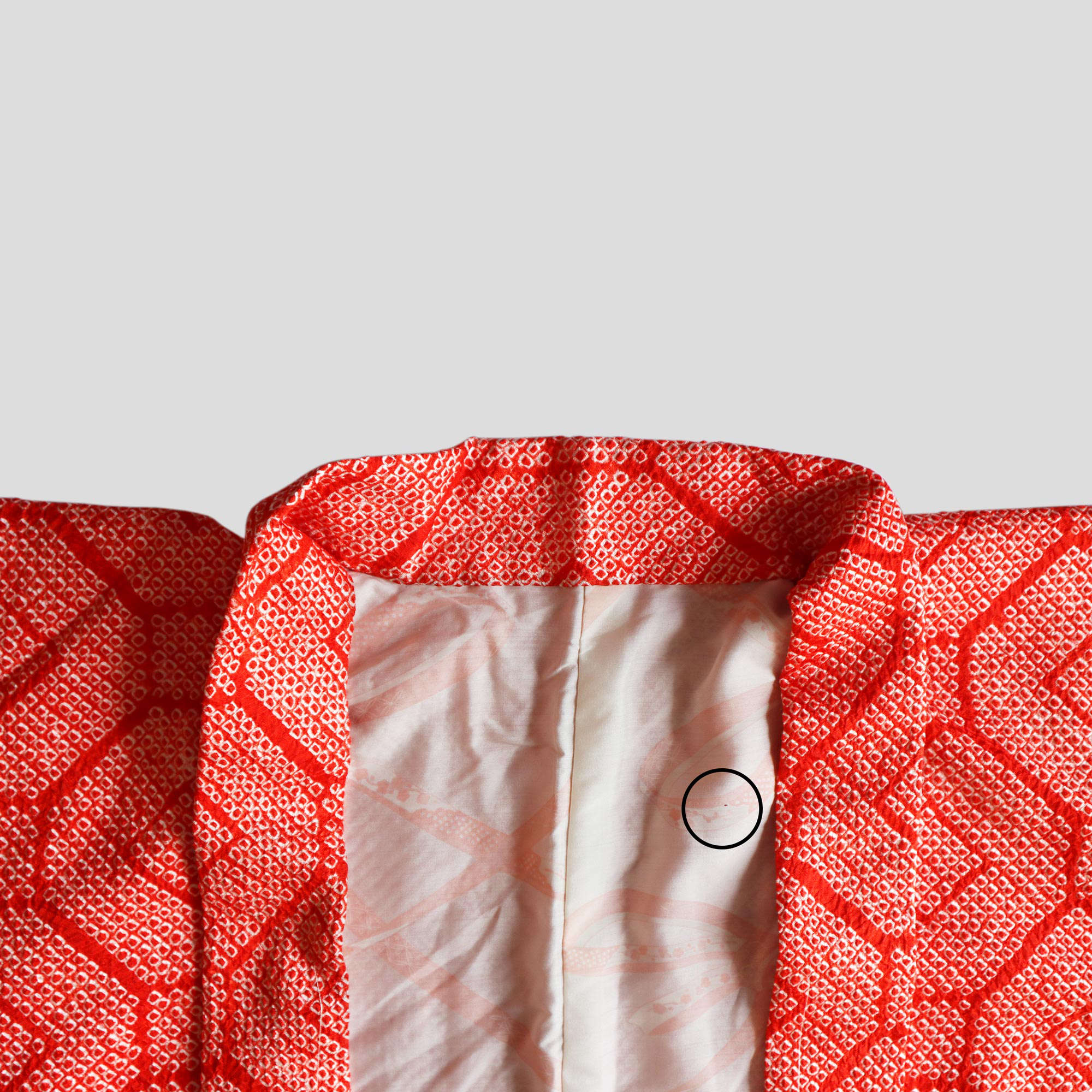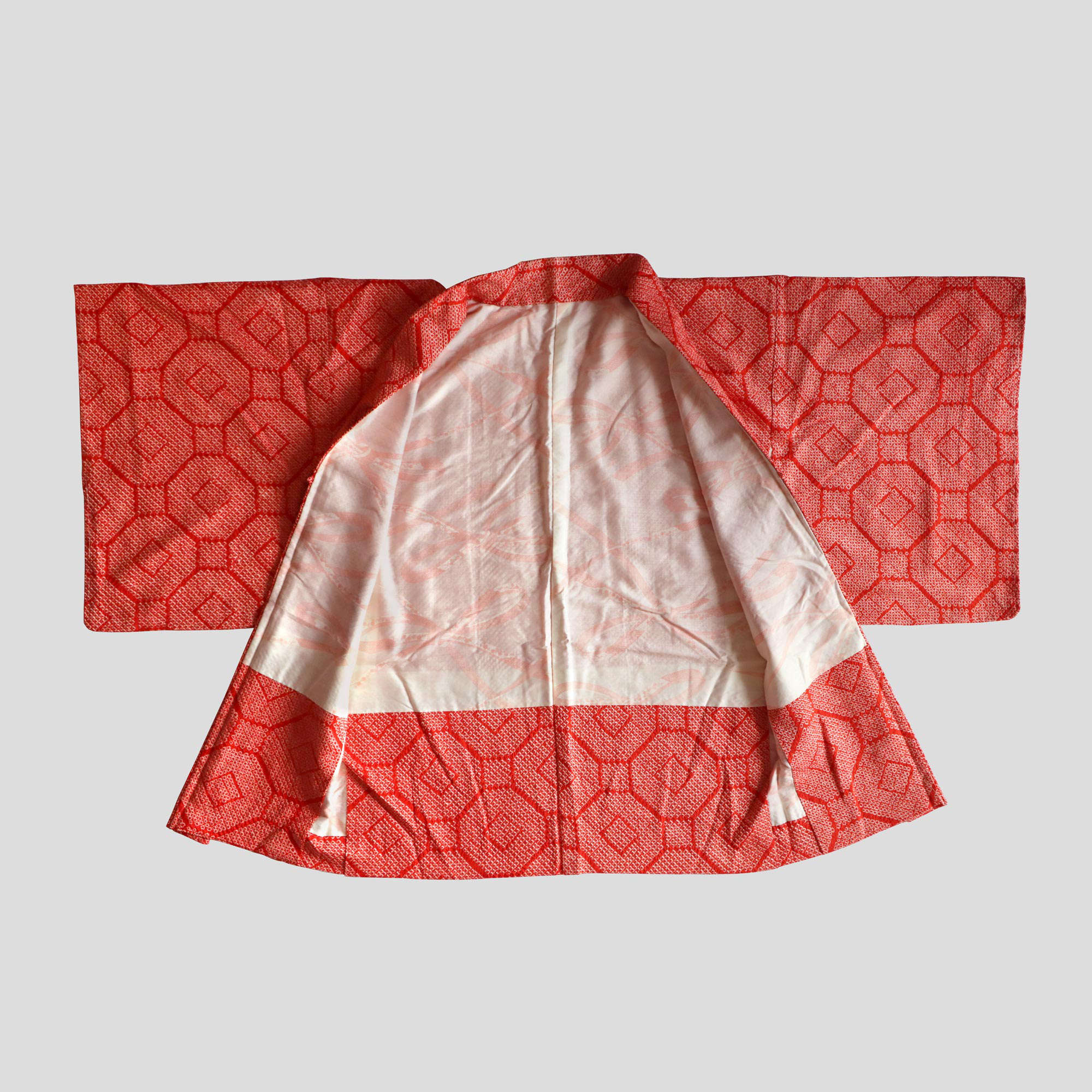 Ce haori exceptionnel se distingue par son rouge vif éclatant et par l’utilisation de la technique traditionnelle Shibori, combinée à des motifs géométriques de losanges, carrés et octogones.