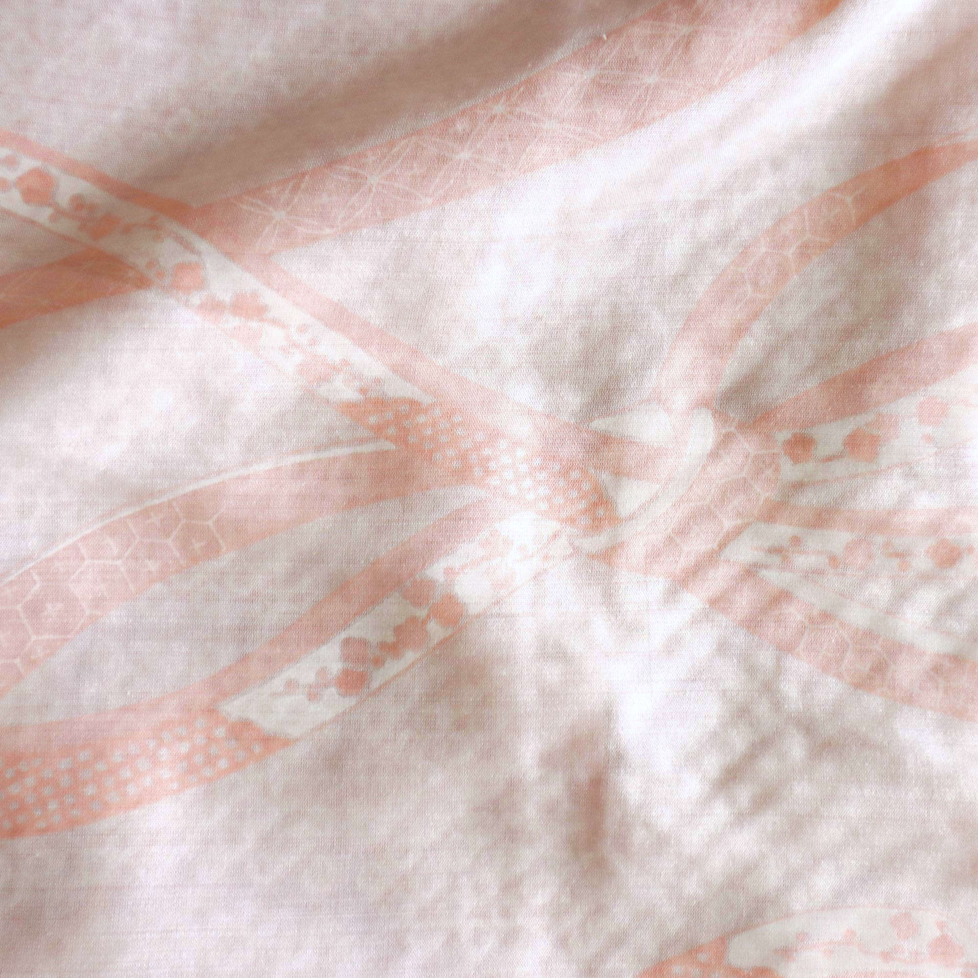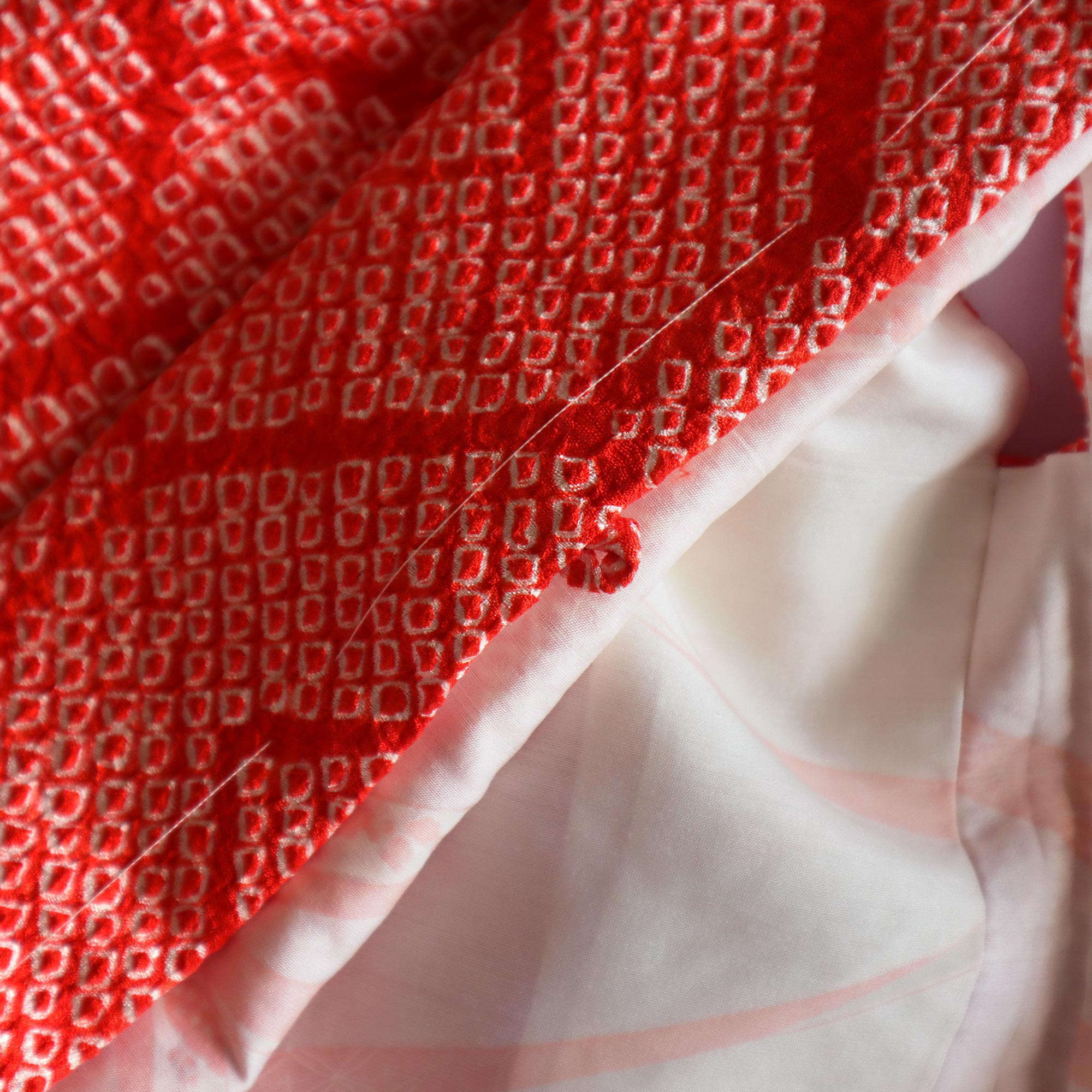Le Shibori est une méthode de teinture japonaise artisanale qui consiste à nouer, plier ou comprimer le tissu avant teinture. Cette technique est utilisée sur ce haori afin de créer une trame régulière rouge sur fond blanc.