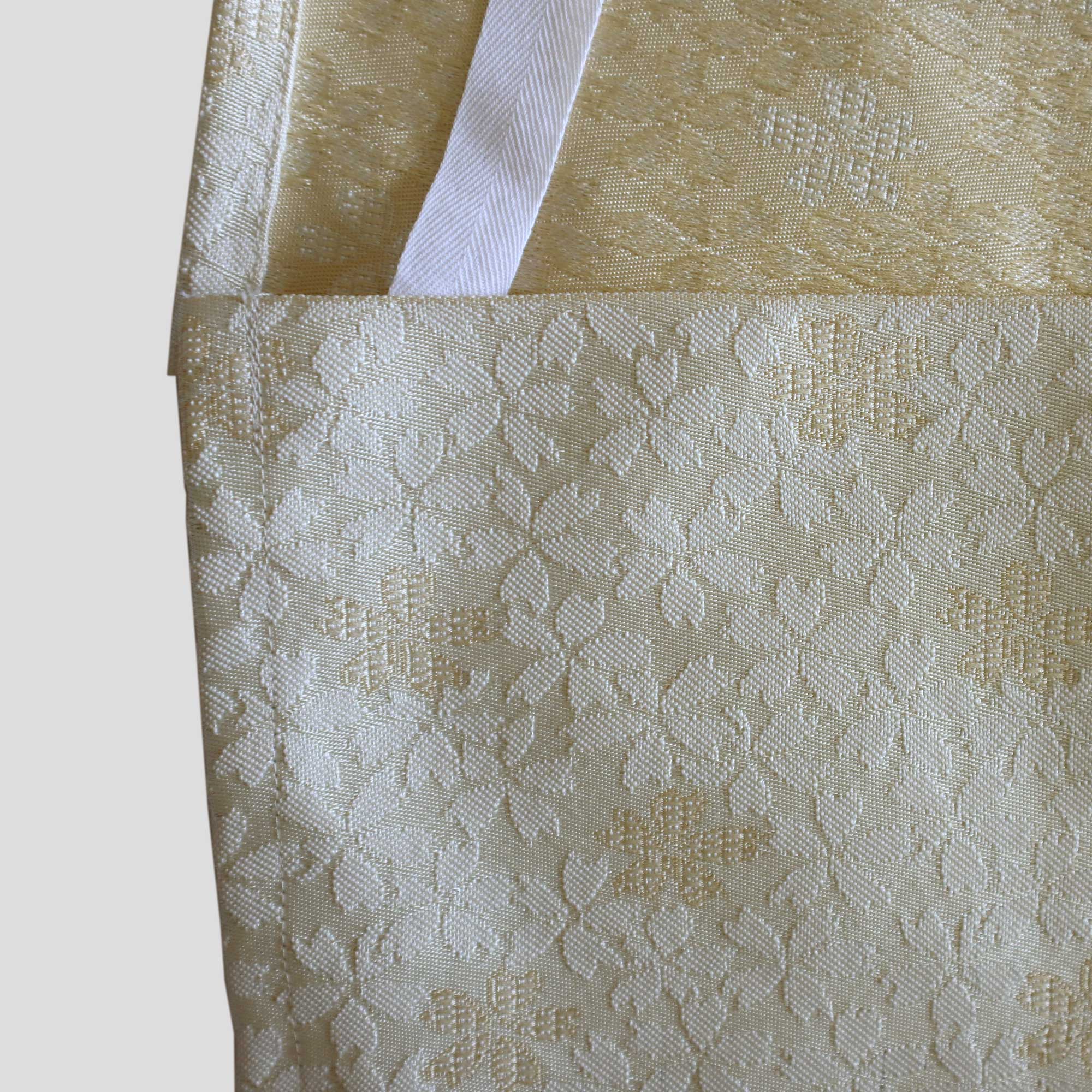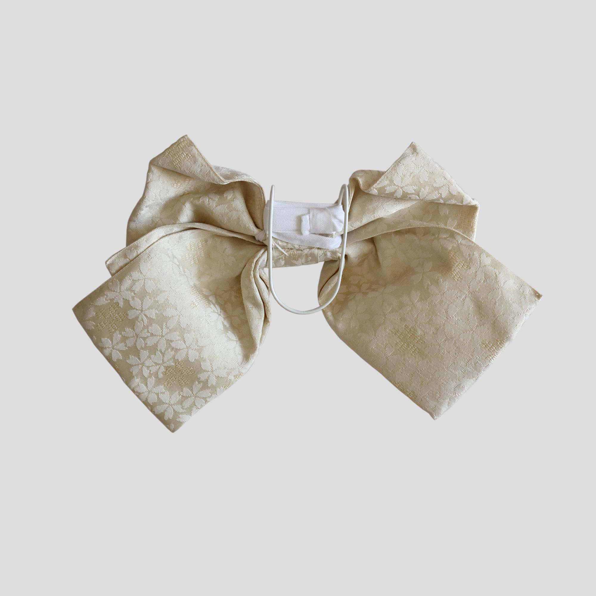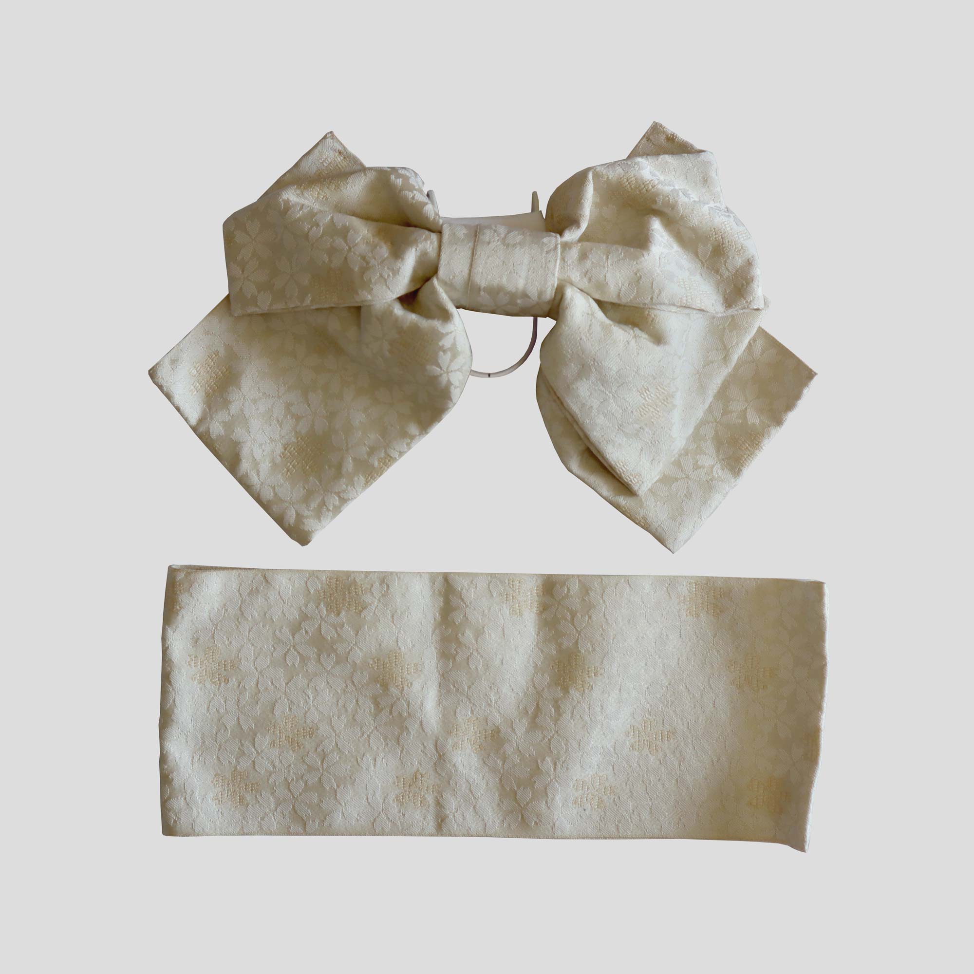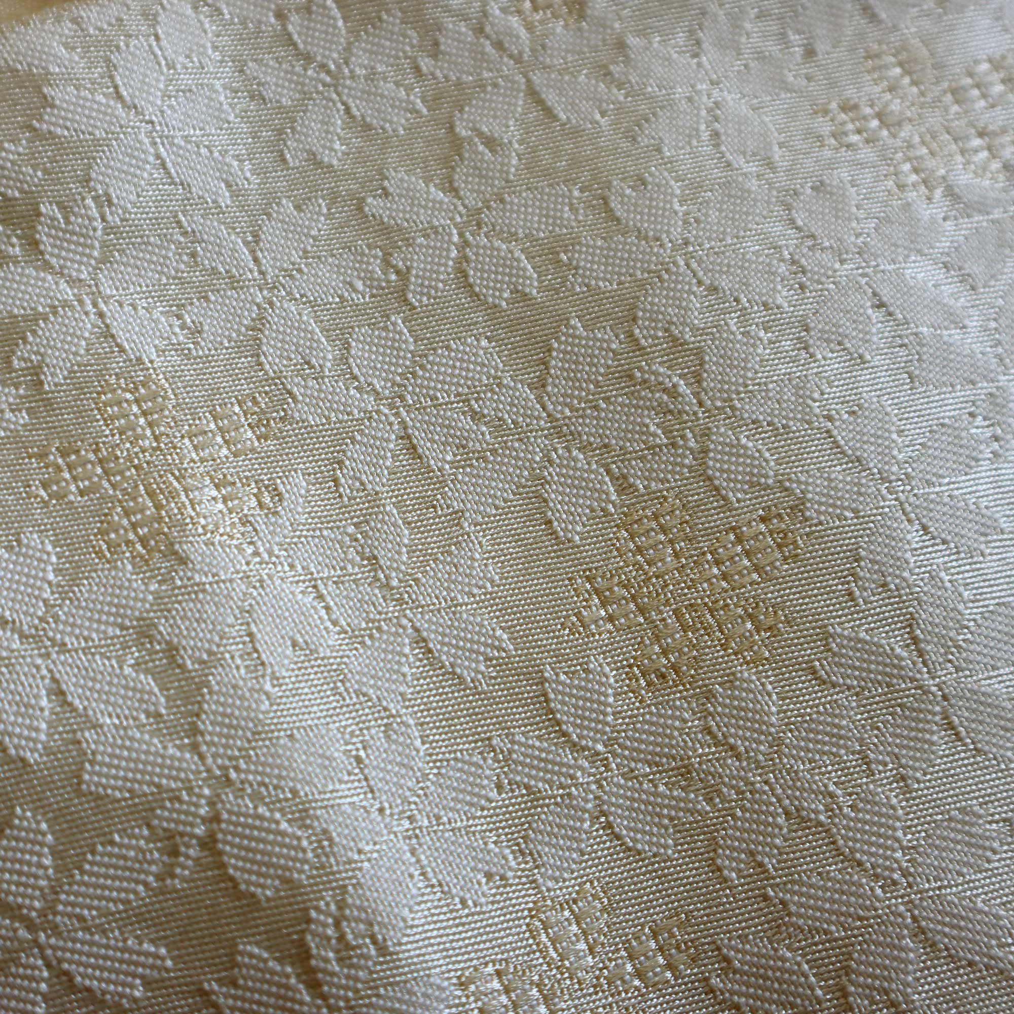 Ce set comprend un obi, la ceinture japonaise traditionnelle portée avec un kimono, accompagné d’un nœud amovible assorti. Le tissu de couleur ivoire est brodé d’une multitude de fleurs de cerisier, évoquant l’élégance et la fraîcheur du printemps japonais. Cette pièce est en excellent état et semble n’avoir jamais été utilisée, ce qui en fait un ajout précieux et authentique à votre garde-robe traditionnelle.